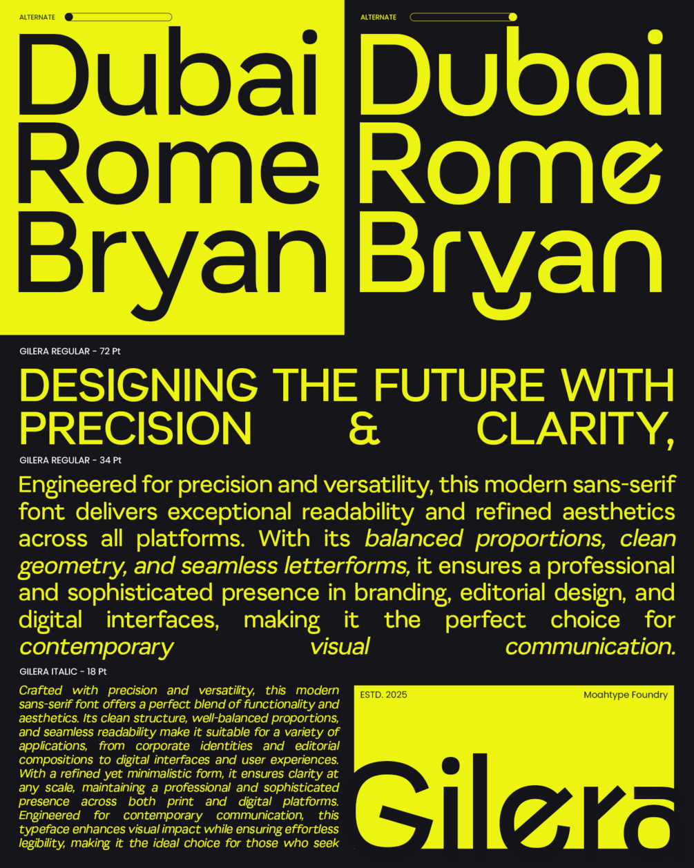 Gilera is a refined sans serif typeface crafted for clarity, balance, and professional impact. Designed with clean lines and modern proportions, Gilera offers excellent legibility across digital and print mediums. Its geometric precision and subtle elegance make it ideal for branding, corporate identity, editorial layouts, and user interface design. With a versatile structure and contemporary feel, Gilera empowers brands to communicate with confidence, simplicity, and strength.